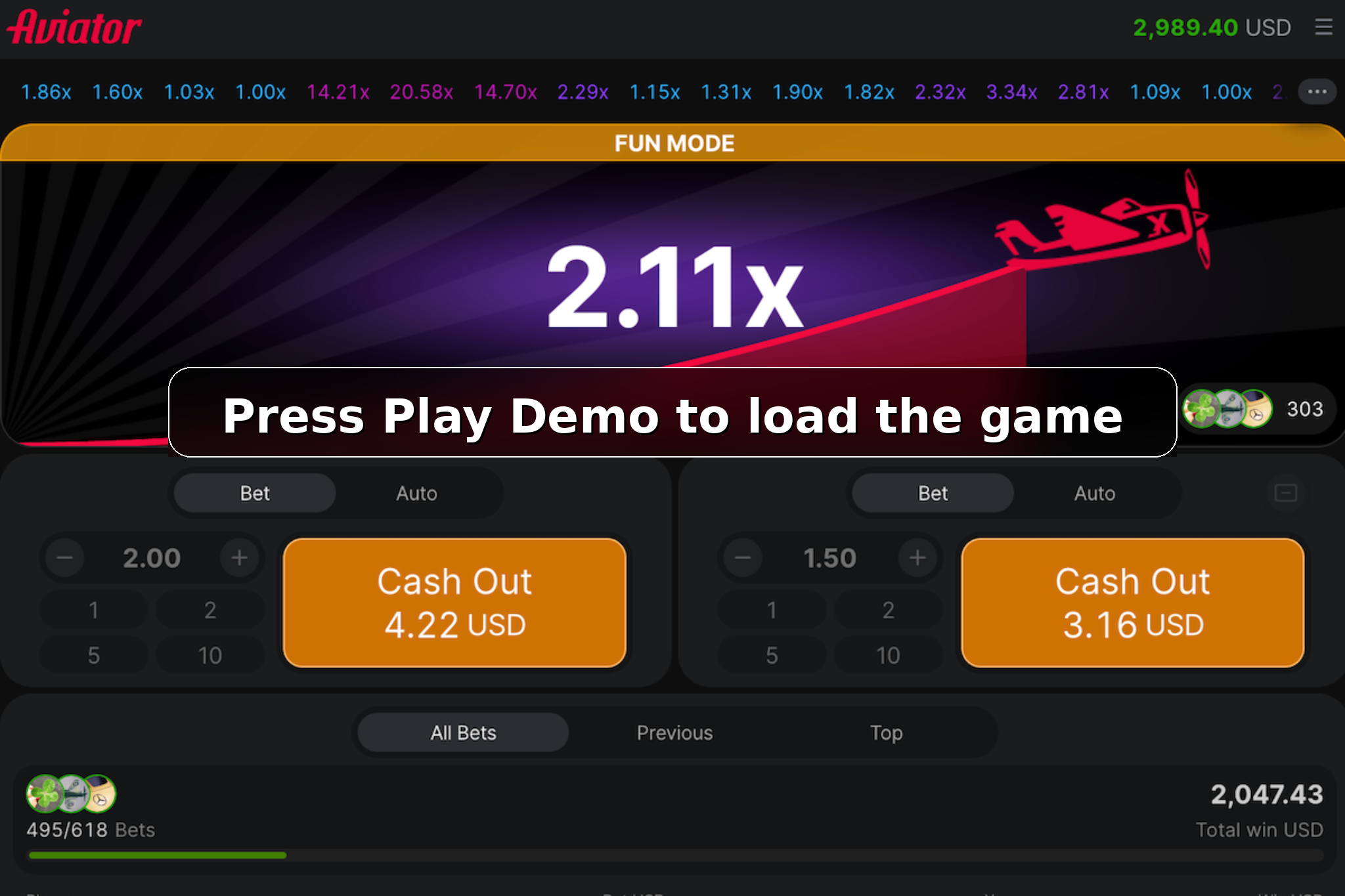Play the Aviator crash game demo by Spribe in your browser. The demo uses play-money credits. Use the second button to open a casino for real-money play.